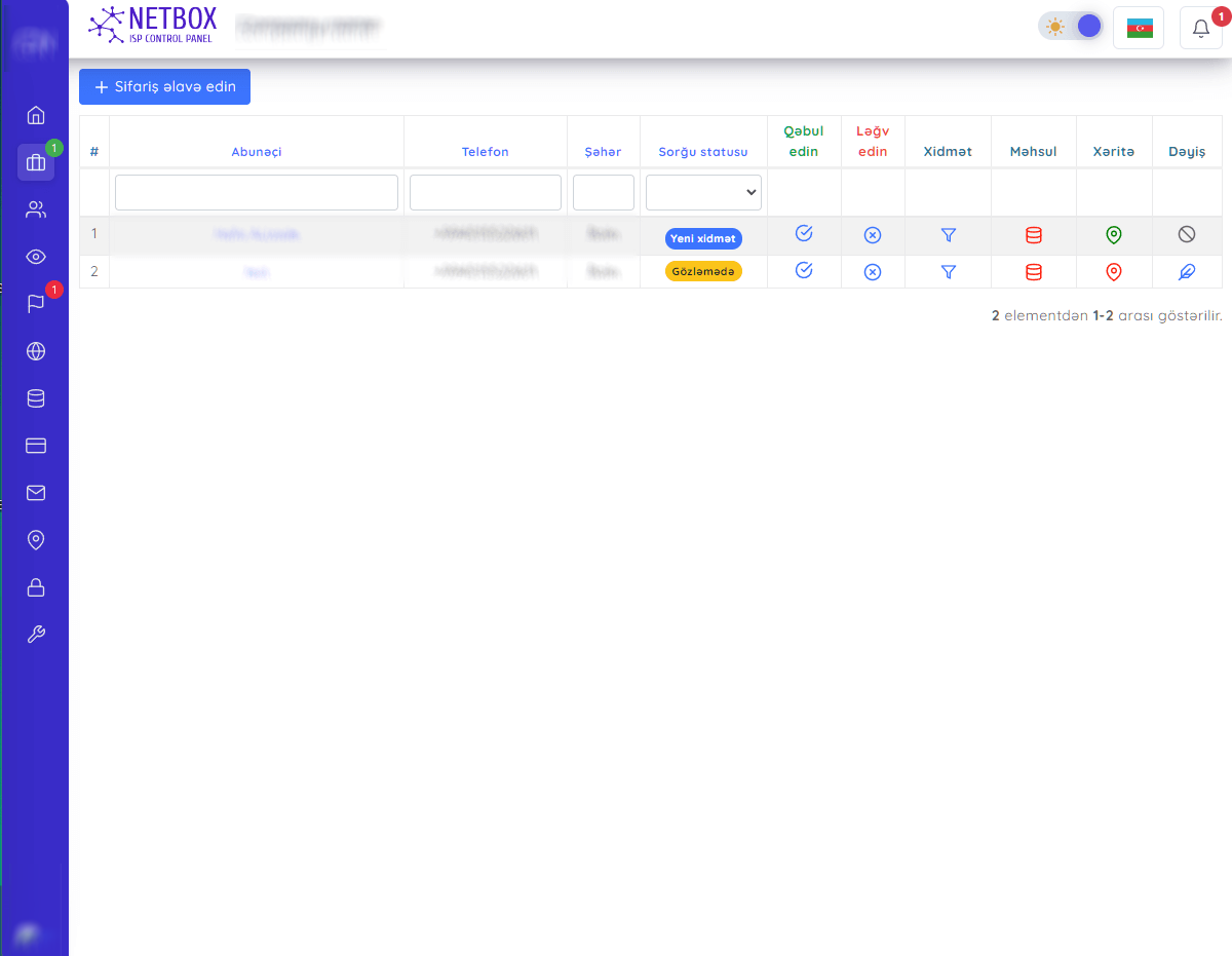 - Xidmətlər - Abunentə təyin etdiyiniz xidmətləri seçirsiniz