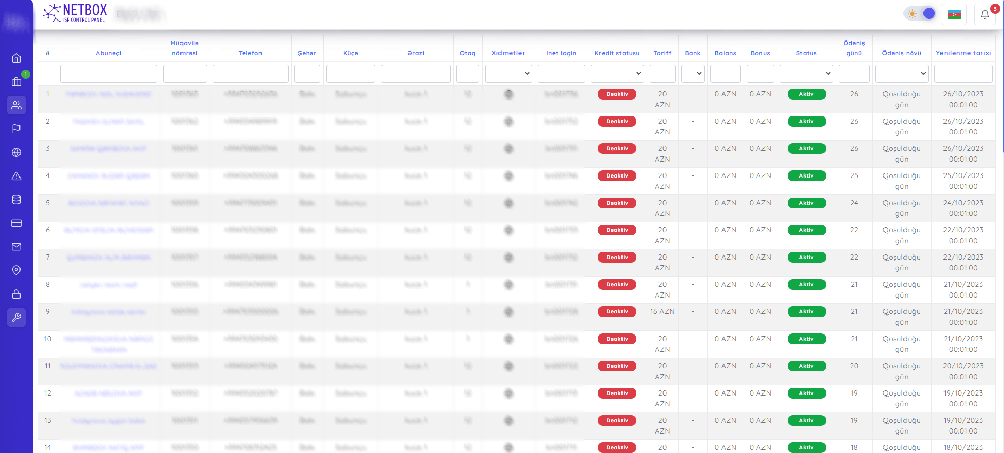 Yuxaridakı xanalarda müvafiq olaraq Abunəçi, Müqavilə nömrəsi, Telefon, Şəhər, Küçə, Ərazi, Otaq, Xidmətlər, İnet login, Kredit statusu, Tariff, Bank, Balans, Bonus, Status, Ödəniş günü, Ödəniş növü,  və Xidmətin yenilənmə tarixinə  görə axtarış edə bilərsiniz. Bu, məlumatlar bazasıda saxladığınız abunəçiləri axtarmağınızı təmin edir