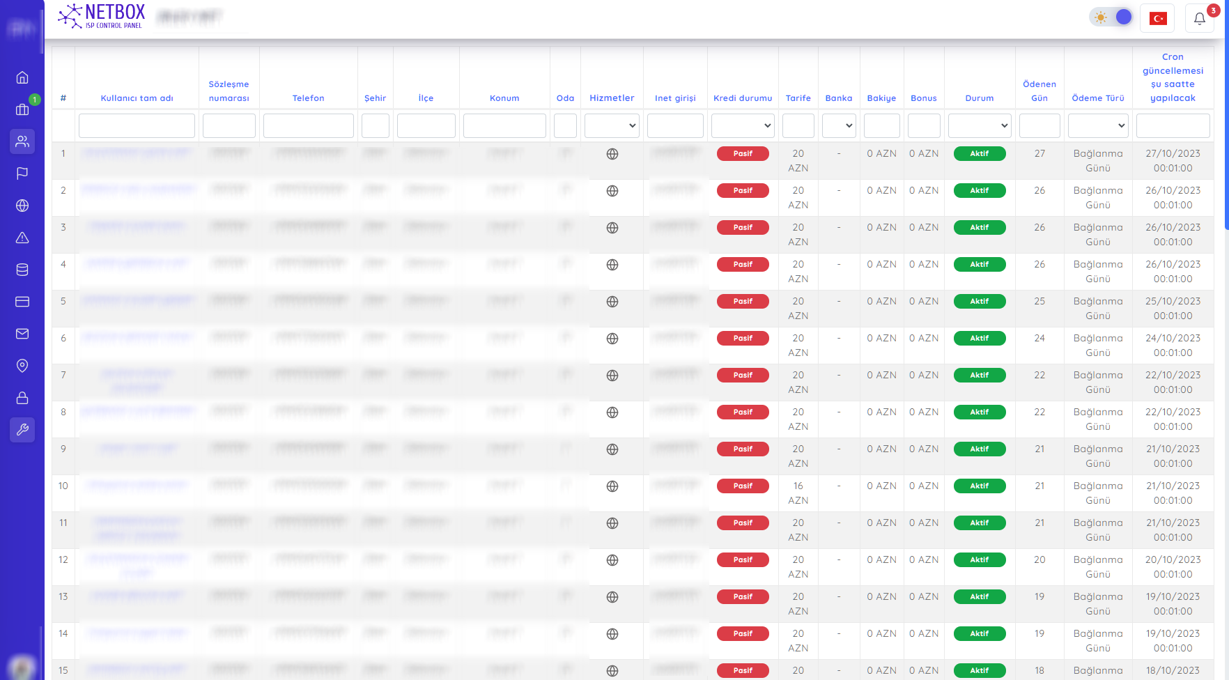 Yukarıdaki alanlarda ilgili alanları arayabilirsiniz: Abone Sözleşme numarası, Telefon, Şehi,r Cadde, Bölge, Oda, Hizmetler,Inet hesbi,Kredi durumu, Tarife, Banka, Bakiye,Bonus, Durum, Ödeme günü, Ödeme türü, Hizmetin yenilenme tarihi